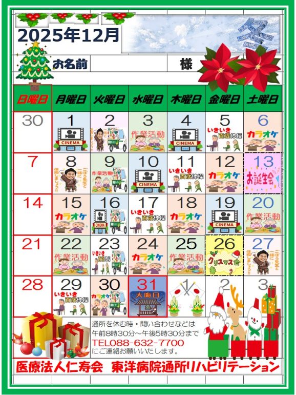 12月は「師走」と伝えられており、季節の変化、新年への取り組みなど、1年の締めくくりを迎えるための準備に忙しくなります。そんな中でも我々は、楽しみ・落ち着き・安心して過ごしていただくための取り組みを実施しております。クリスマス会で一緒に楽しみましょう(^O^)