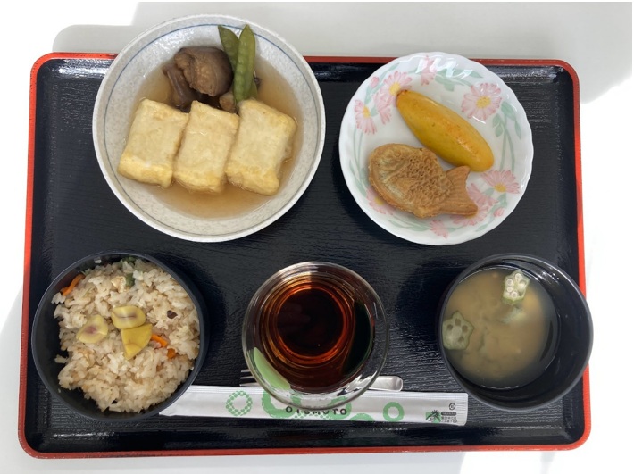 お味噌汁には、断面が星のような形をした「オクラ」を合わせました。 そして、食後のお楽しみとして、可愛らしい「たいやき」と、艶やかな「大学芋」のデザートを添えています。