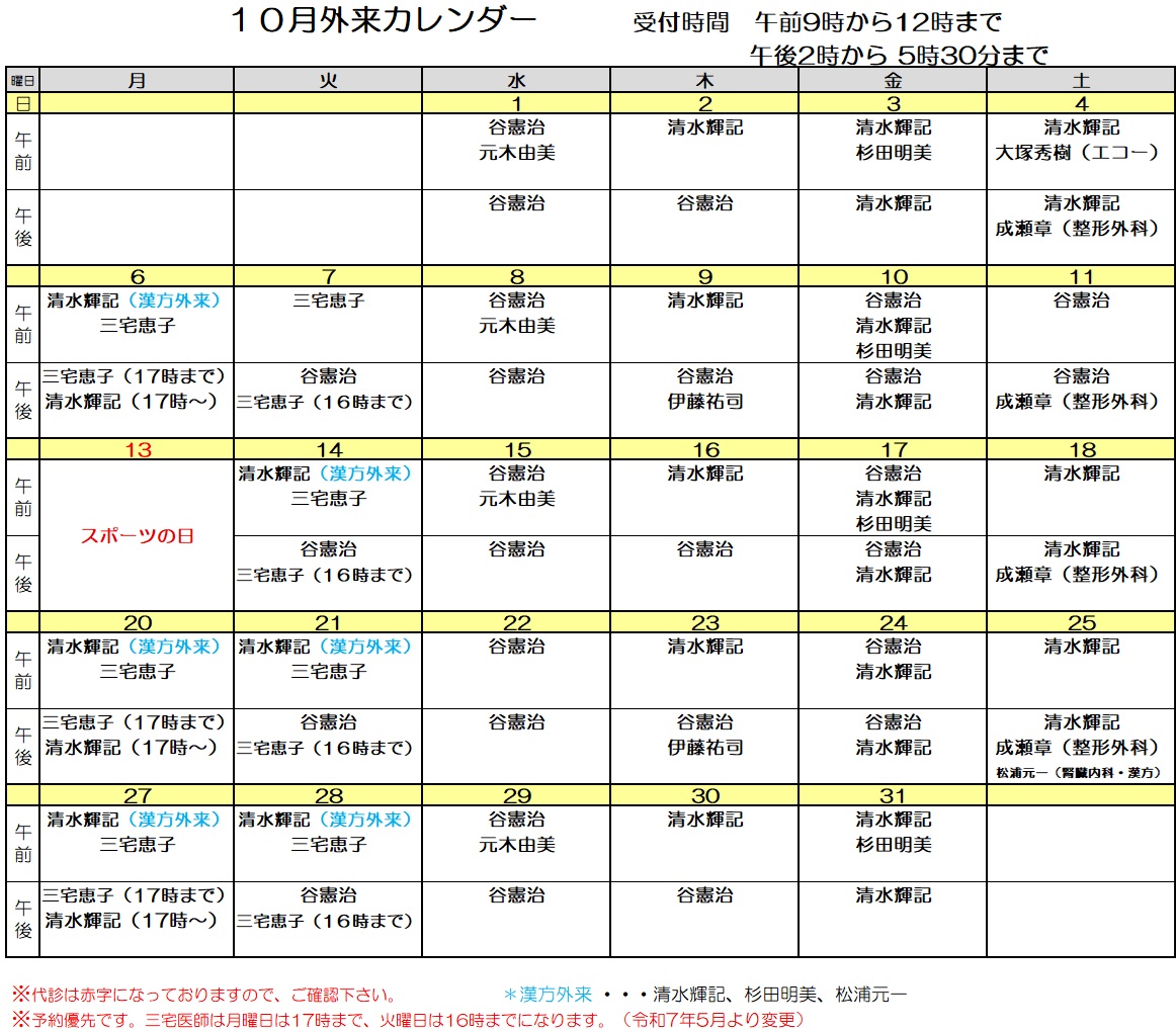 2025年10月 外来担当医表